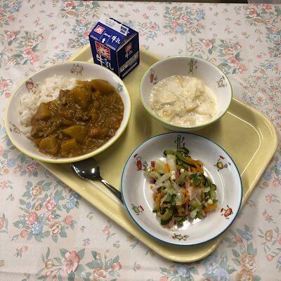 ドリア風カレーピラフ オニオンスープ かぶのサラダ ココアゼリー 牛乳