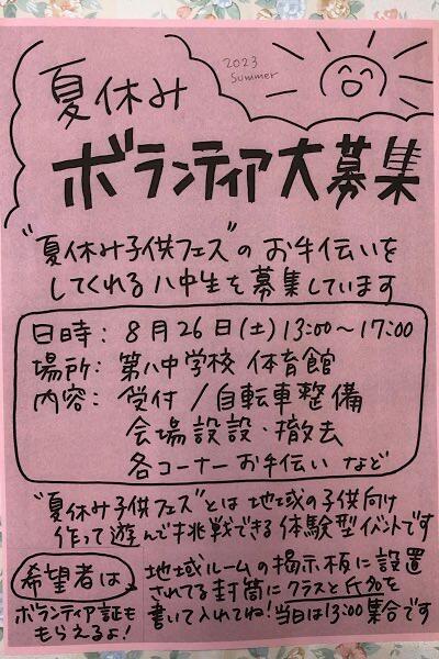 コミュニティクラブからお知らせ 投稿日時 : 2023/07/11 oka コロナ前に、行われていたお化け屋敷をリニューアルして開催されます 中学生希望者は、ボランティア体験ができます 『いいね!』カウンターを増やして、チーム八中を応援しましょう