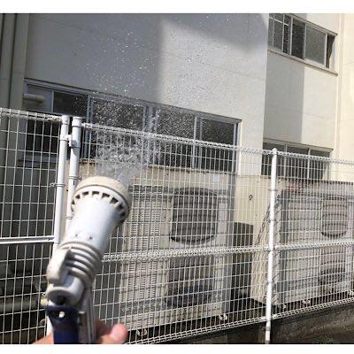 教室のエアコンにつながる室外機と周辺に水をまき、気加熱で冷やして冷却効率を高めています