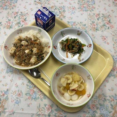 今日の給食 投稿日時 : 2023/11/06 oka マーボー丼 ナムル フルーツ白玉 牛乳 大きめカットの木綿豆腐に、ひき肉と細かいカットした野菜が絡み、 ごはんがすすむ味付けに仕上がりました フルーツは、パイン、バナナ、りんご、オレンジボールを使っています 健康寿命日本一を目指す街いちかわの給食 『いただきます』『ごちそうさま』に感謝を込め、 栄養バランスを考えて、おいしく食べましょう