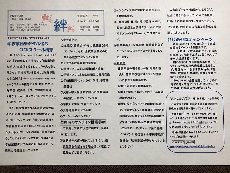 学校だよりNo.9 投稿日時 : 2022/09/30 oka 本日発行です PDFは、八中H P各種おたよりにアップいたします 紙ベースが必要なご家庭は、各学級で配付いたします 『いいね!』カウンターを増やして、チーム八中を応援しましょう