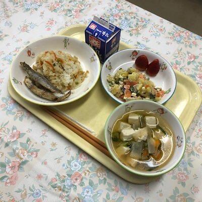 サケのパン粉焼き どさんこ汁 わかめサラダ ごはん イチゴ 牛乳