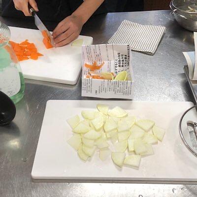 午前中に調理員さんたちが、空のコンテナを異動して搬入準備をしています