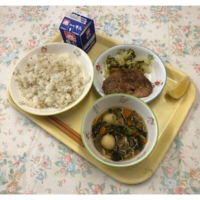 菜飯 鶏のレモン煮 田舎汁 磯和え 牛乳