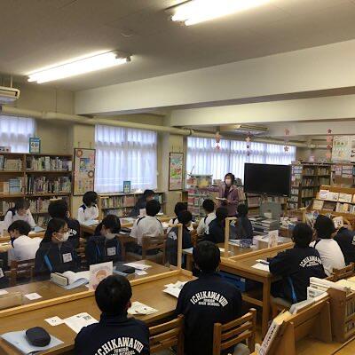 司書の先生から、図書室の使い方と本選びの説明をしています
