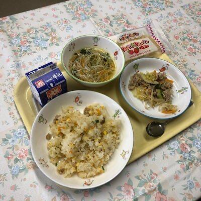 タケノコごはん ぶりの竜田揚げ すまし汁 麩のシナモンシュガー