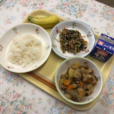 いりどり煮 納豆あえ ごはん バナナ 牛乳