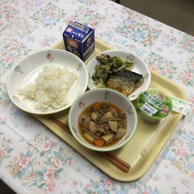 サバのゴマだれ焼き 芋煮 おかかサラダ ごはん マスカットゼリー 牛乳