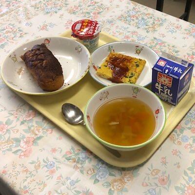 スパニッシュオムレツ 野菜スープ ココア揚げパン ヨーグルト 牛乳