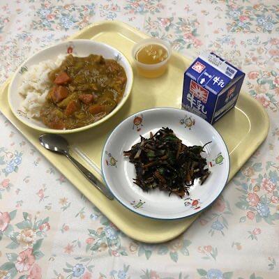チキンカレー 玄米ごはん ひじきのマリネ りんごゼリー 牛乳