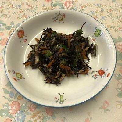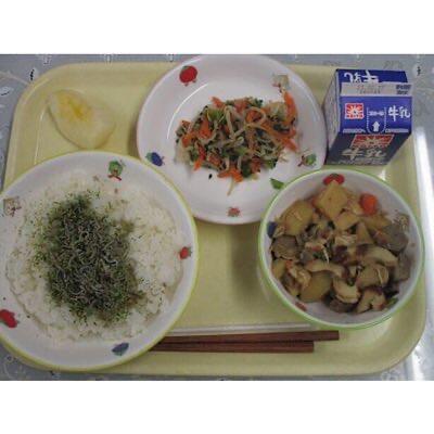 ごはん、煎り鶏煮、ツナの和え物、手作りふりかけ、りんご、牛乳