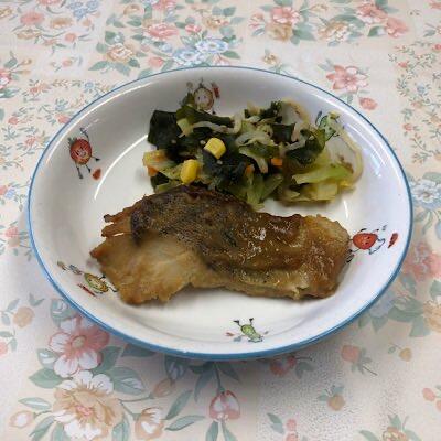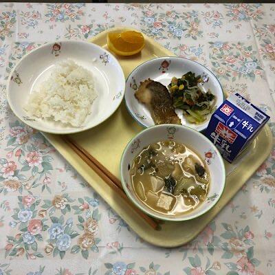 タラのみそ焼き 八宝みそ汁 コーン入りゴマ酢和え オレンジ 牛乳