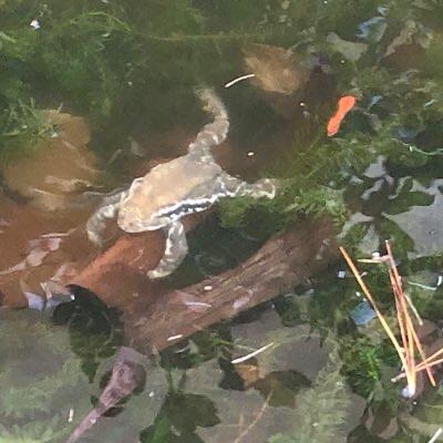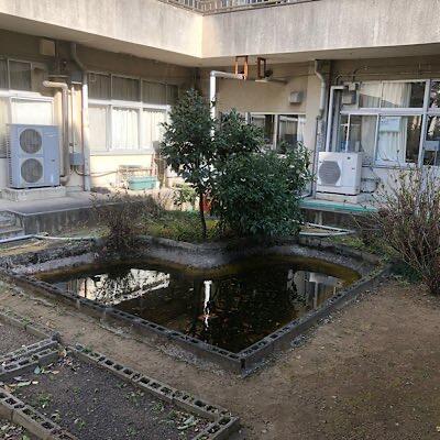 八中校舎に囲まれた中庭のハート型の池にカエルが戻りました