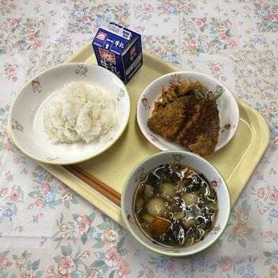 アジフライ だまこ汁 辛子和え ごはん 牛乳