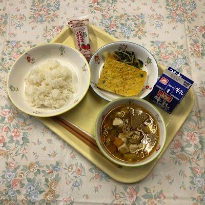 五目ごはん、ちくわの磯辺揚げ、さつま汁、コーン和え、タルト、牛乳