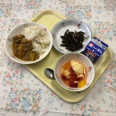 ポークカレー 玄米ごはん ひじきのマリネ フルーツポンチ 牛乳