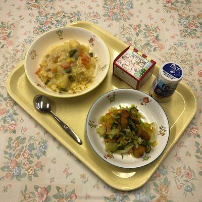 キャロットライスのコーンシチューかけ チキンのコロコロサラダ クリスマスデザート ジョア