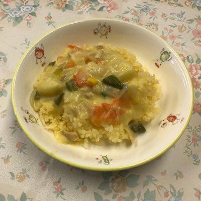 ふっくらピラフにクリーミーなホワイトシチューを合わせ、