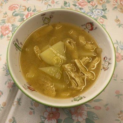 具だくさん(油揚げ、ジャガイモ、大根、ネギ)のおみそ汁は、栄養豊富、食べ応えあり
