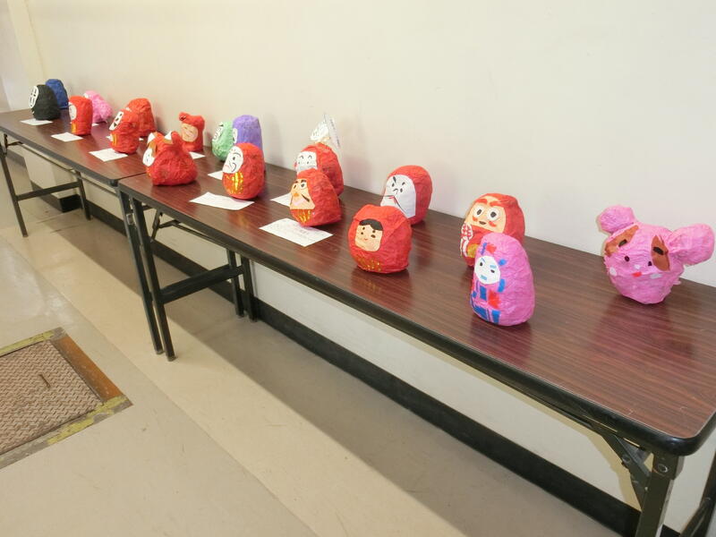 のぞみ学級の教室前には、手作りのだるまが飾られています。
