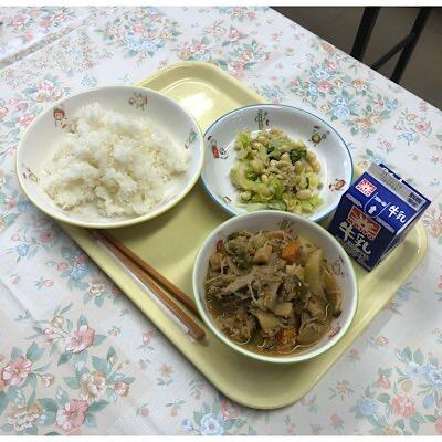 ひき肉ごまじゃが 大豆とハムのサラダ ごはん 牛乳