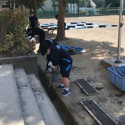 ボランティア作業で校庭わきの側溝につまった土砂を取り除いています