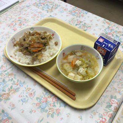 きのこスパゲッティ 具だくさんスープ フレンチキュウリ 人参ケーキ 牛乳