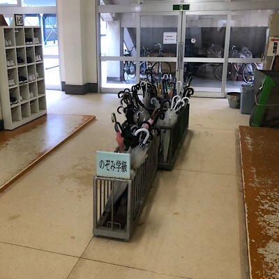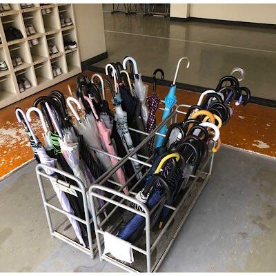 大人数で使うカサ立ての知恵は…『カサをまとめ、ベルトで留め、抜き取りやすい向きにそろえます』