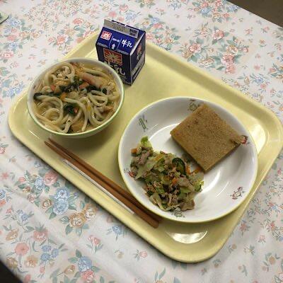 きつねうどん 焼肉サラダ バナナパウンドケーキ 牛乳