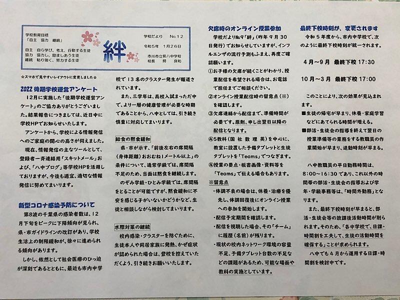 内容:後期学校運営アンケート、新型コロナ感染予防、欠席時のオンライン授業参加、最終下校時刻の変更(令和5年度)、八中ブログ2022いいね!ランキング(裏面・八中ブログに先月アップしたもの)