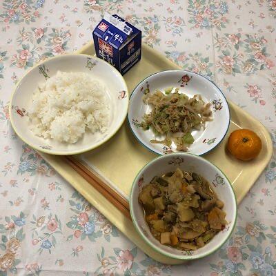 ひき肉ごまじゃが ツナとキャベツ和え物 ごはん 冷凍みかん 牛乳
