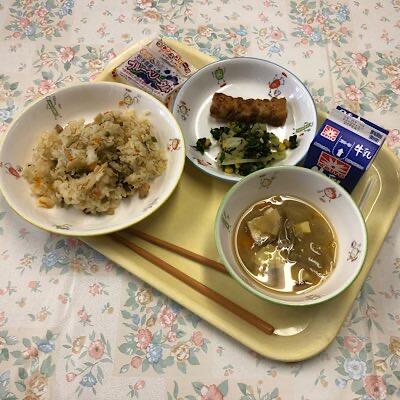 五目ごはん、ちくわの磯辺揚げ、さつま汁、コーン和え、タルト、牛乳