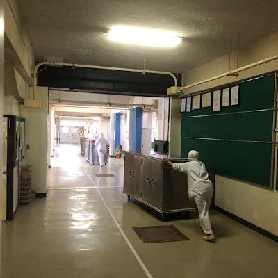 八中の給食は、平田小学校給食室で調理したものが、保温コンテナに入ってトラックで届けられます