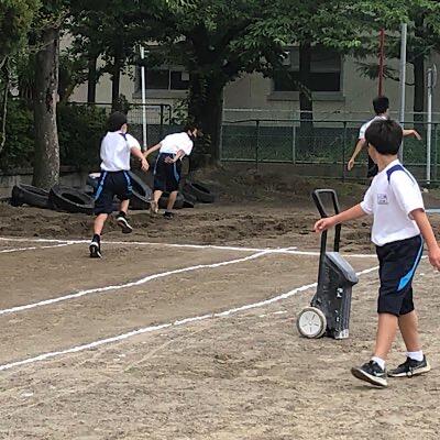 1校時 一学年 体育 走り幅跳び、短距離走を学習しています