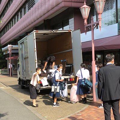 荷物をトラックに積み込んで、バスでクラス別コースに出発します