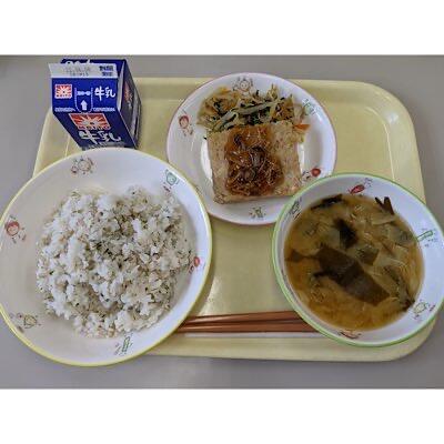 海苔麦ごはん みそ汁 豆腐ハンバーグ もやし和え 牛乳