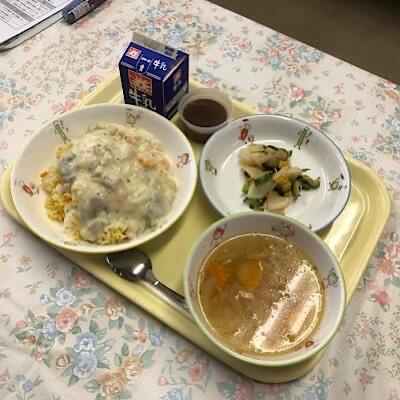 ドリア風カレーピラフ オニオンスープ かぶのサラダ ココアゼリー 牛乳