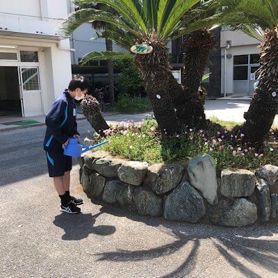 昼休み 整美委員会メンバーが、お花の世話をしています