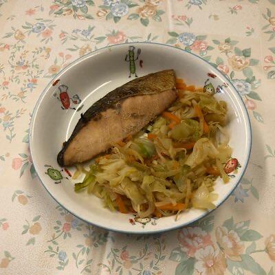 ごはん、鮭の塩焼き、キャベツのごま酢和え、肉じゃがピリ辛煮、牛乳
