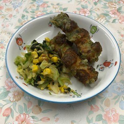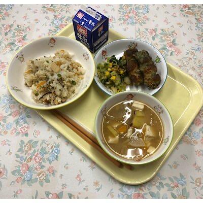 五目ごはん 竹輪いそべ揚げ さつま汁 コーン和え 牛乳