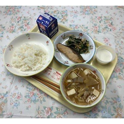 鮭のしょうが焼き 豚汁 ごはん からし和え ミルクプリン 牛乳