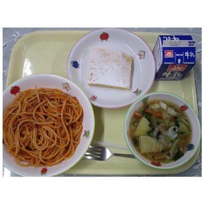 スパゲッティボロネーゼ、キャベツスープ、パイナップルケーキ、牛乳