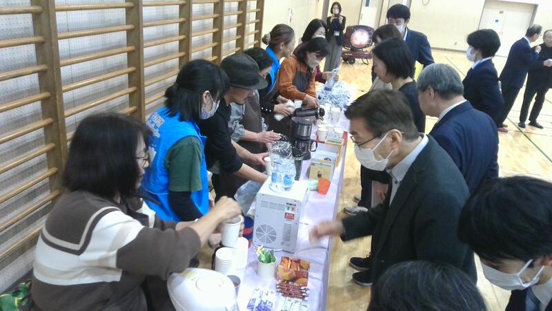 3校の教員が集まっているのが「ブロック定例研」の要素、3校の協議会委員が集まっているのが「合同学校運営協議会」の要素、地域学校協働活動推進員さんたちが飲み物を用意されているのが「ティーチャーズカフェ」の要素が入っています。3つの取組を一気に合わせて開催しようというのが今回の試みです。