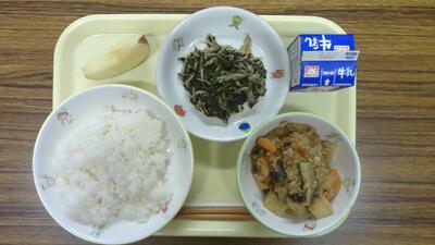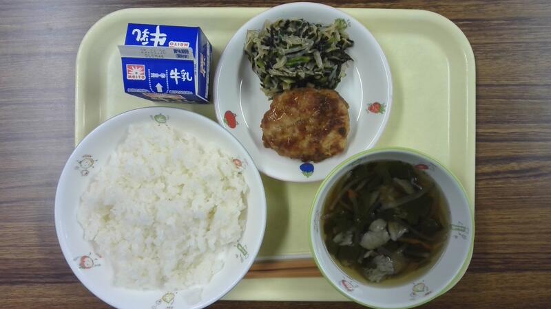 ごはん、生揚げの味噌煮、ほうれん草の梅磯和え、りんご、牛乳でした。