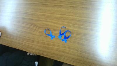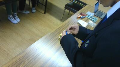作業は青色のリボンとピンで作るという単純なものですが、実際に作ってみると意外と難しく、きれいに作るためには「手先の器用さ」と「慣れ」が必要な作業であることがわかります。