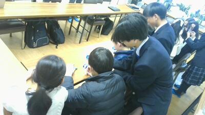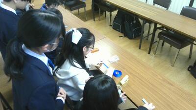 12月3日(水)、東国分中学校の生徒会役員が曽谷小学校の代表委員にブルーリボンの作り方を伝えに曽谷小学校を訪問しました。