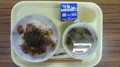 焼き鳥丼、豆腐の味噌汁、手作りリンゴゼリー、牛乳でした。