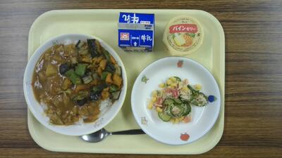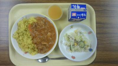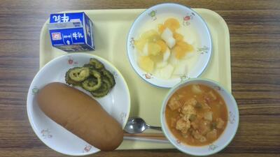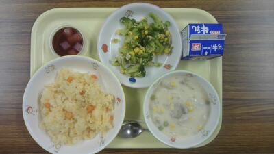 さつまいもピラフ、米粉マカロニのミネストローネ、鶏肉のレモン揚げ、フレンチきゅうり、牛乳でした。