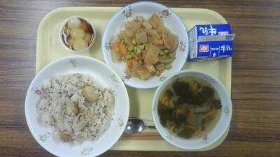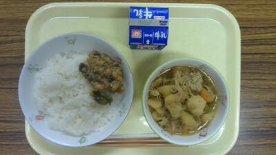 ごはん、かつおの竜田揚げ、筑前煮、かき玉汁、牛乳でした。
