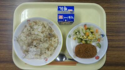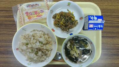 鰯(イワシ)ご飯、けんちん汁、大豆入りお麩のきな粉ラスク、牛乳でした。